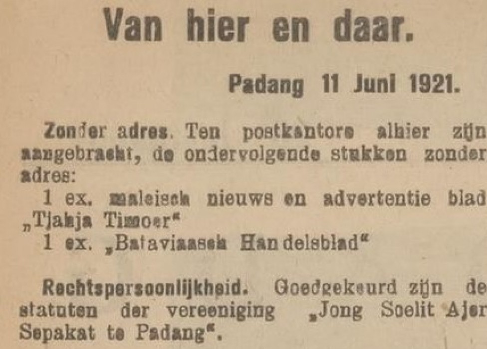 "Rechtspersoonlijkheid. Goedgekeurd zijn de statuten der vereeniging .Jong Soelit Ajer Sepakat te Padang"